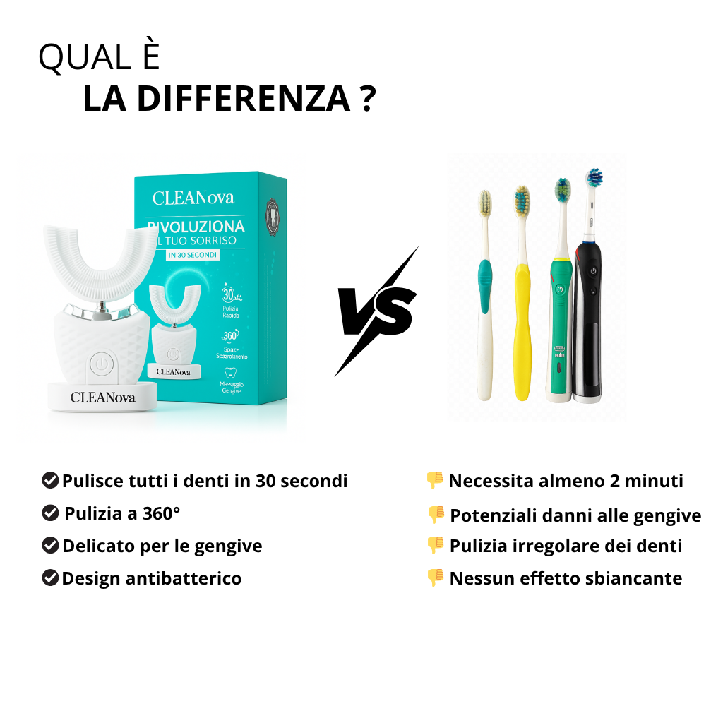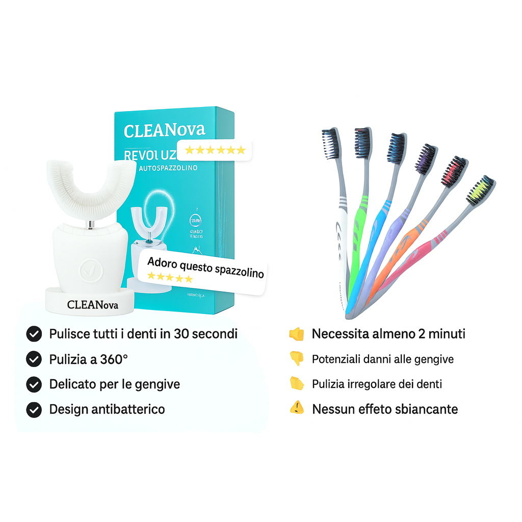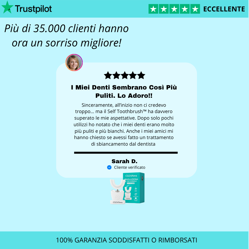 Il Self Toothbrush™ by CLEANova rivoluziona l’igiene orale grazie al suo design innovativo a forma di U e alla tecnologia sonica all’avanguardia, che consente di pulire il 100% dei denti in soli 30 secondi, rispettando allo stesso tempo smalto e gengive. Elegante, ergonomico e semplice da usare, offre ogni giorno una sensazione di pulizia professionale e aiuta a mantenere un sorriso splendente, sano e sicuro. Già adottato da migliaia di utenti, è apprezzato dal 98% dei nostri clienti che affermano di sorridere più spesso da quando lo utilizzano.