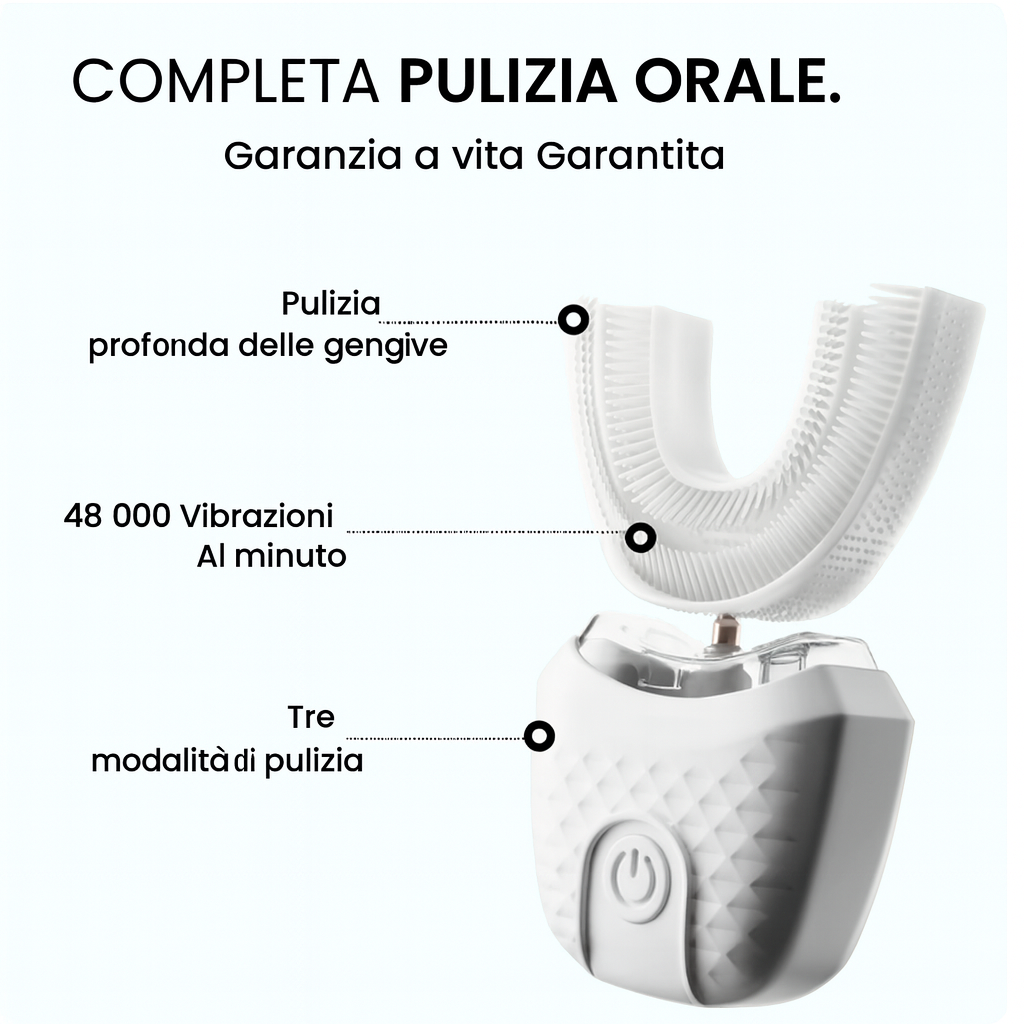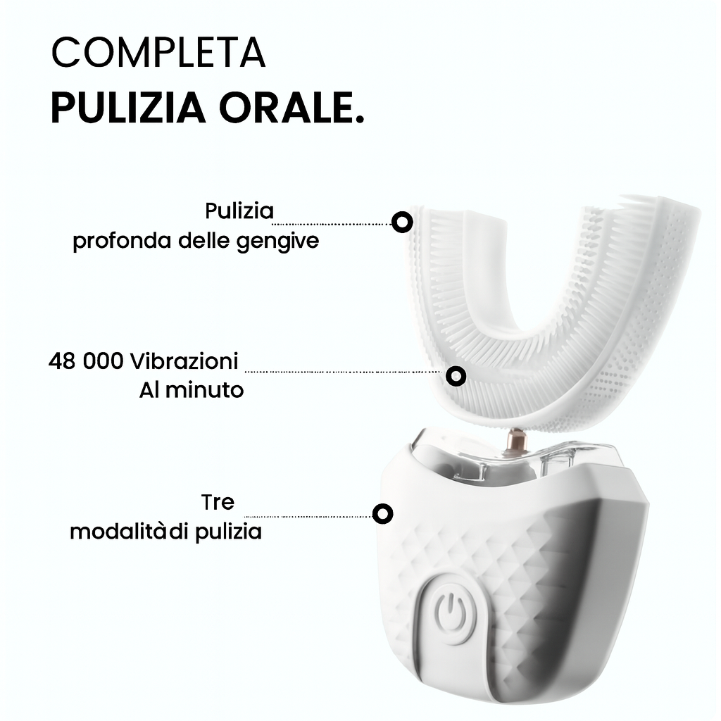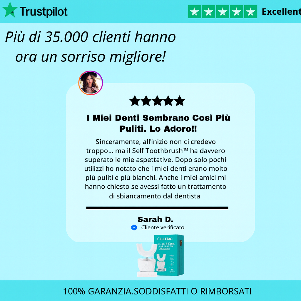 Il Self Toothbrush™ by CLEANova rivoluziona l’igiene orale grazie al suo design innovativo a forma di U e alla tecnologia sonica all’avanguardia, che consente di pulire il 100% dei denti in soli 30 secondi, rispettando allo stesso tempo smalto e gengive. Elegante, ergonomico e semplice da usare, offre ogni giorno una sensazione di pulizia professionale e aiuta a mantenere un sorriso splendente, sano e sicuro. Già adottato da migliaia di utenti, è apprezzato dal 98% dei nostri clienti che affermano di sorridere più spesso da quando lo utilizzano.