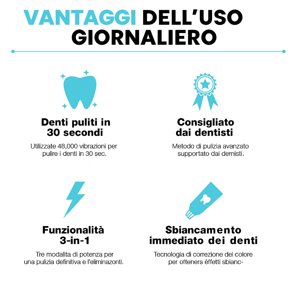 Molte persone soffrono di placca, macchie, gengive sensibili o semplicemente non hanno il tempo di lavarsi bene i denti. Il Self Toothbrush™ by CLEANova, grazie al suo design a forma di U e alla tecnologia sonica, pulisce il 100% dei denti, elimina la placca, protegge lo smalto e dona ogni giorno un sorriso più bianco e più sano, con la massima semplicità.